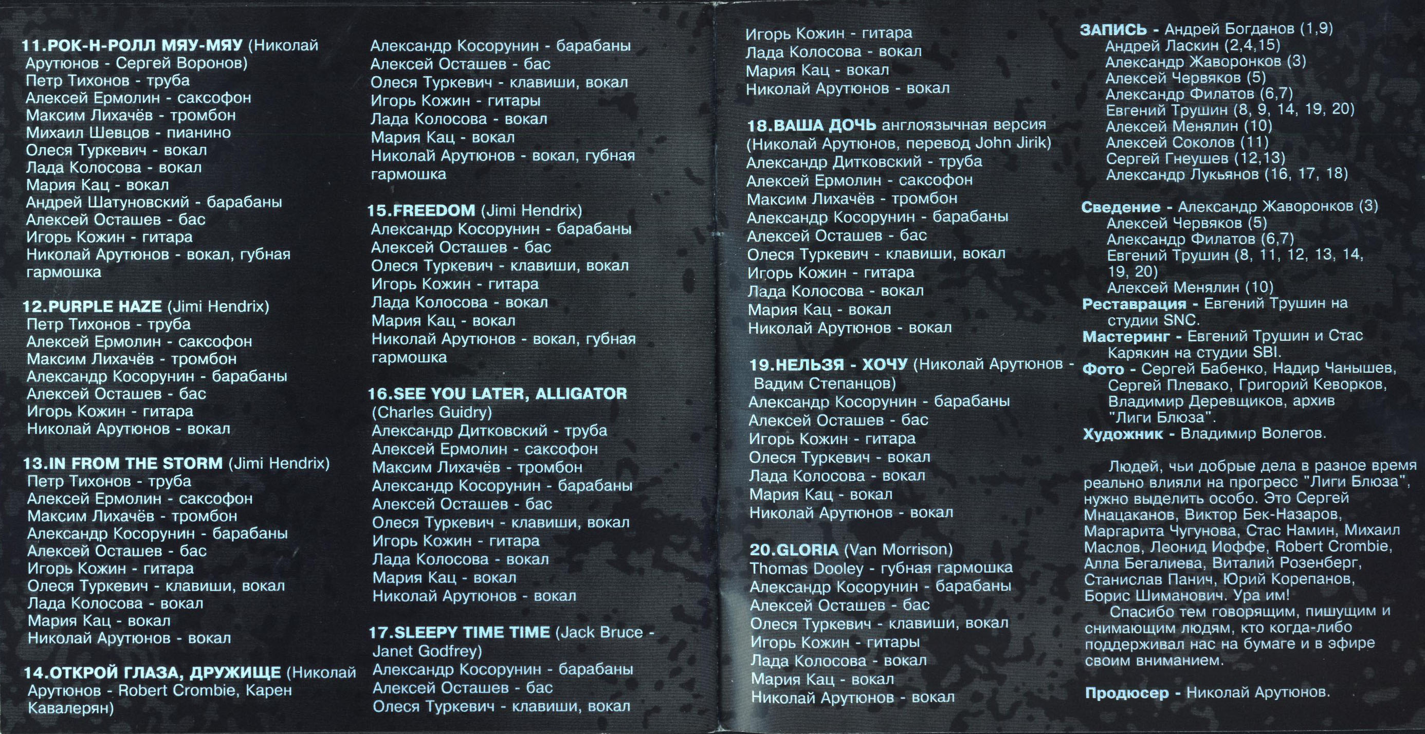 Николай АрутюновПолный список песен "Лиге Блюза" - 10 лет (1990) Лига Блюза - Да здравствует ритм-энд-блюз (1991) Лига Блюза - Да здравствует ритм-энд-блюз (1993) Лига Блюза - Неужели прошло 15 лет (1995) Лига Блюза - Неужели прошло 15 лет / LP (1995) Лига Блюза - Живая колекция (2001) Четверг Арутюнова (2004) Голос (2005) Funky Soul (2008) A singer in a Band (2012) The Blues Barbarians - Live in Minsk (2012) Funky Soul - Бронефанк (2013) Quorum - Piggy Pig Pig (2017) Funky Soul - Между нами (2022) |