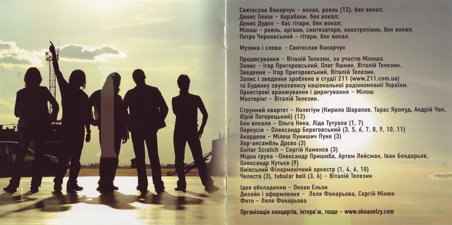 Океан ЕльзиПолный список песен Разные песни Будинок зi скла (1997) Там, де нас нема (1998) Янанебiбув (2000) Модель (2001) Суперсиметрiя (2003) Gloria (2005) Мiрa (2007) Dolce Vita (2010) Земля (2013) Без меж (2016) Святослав Вакарчук Вночі (2008) Брюссель (2011) Оранжерея (2021) |