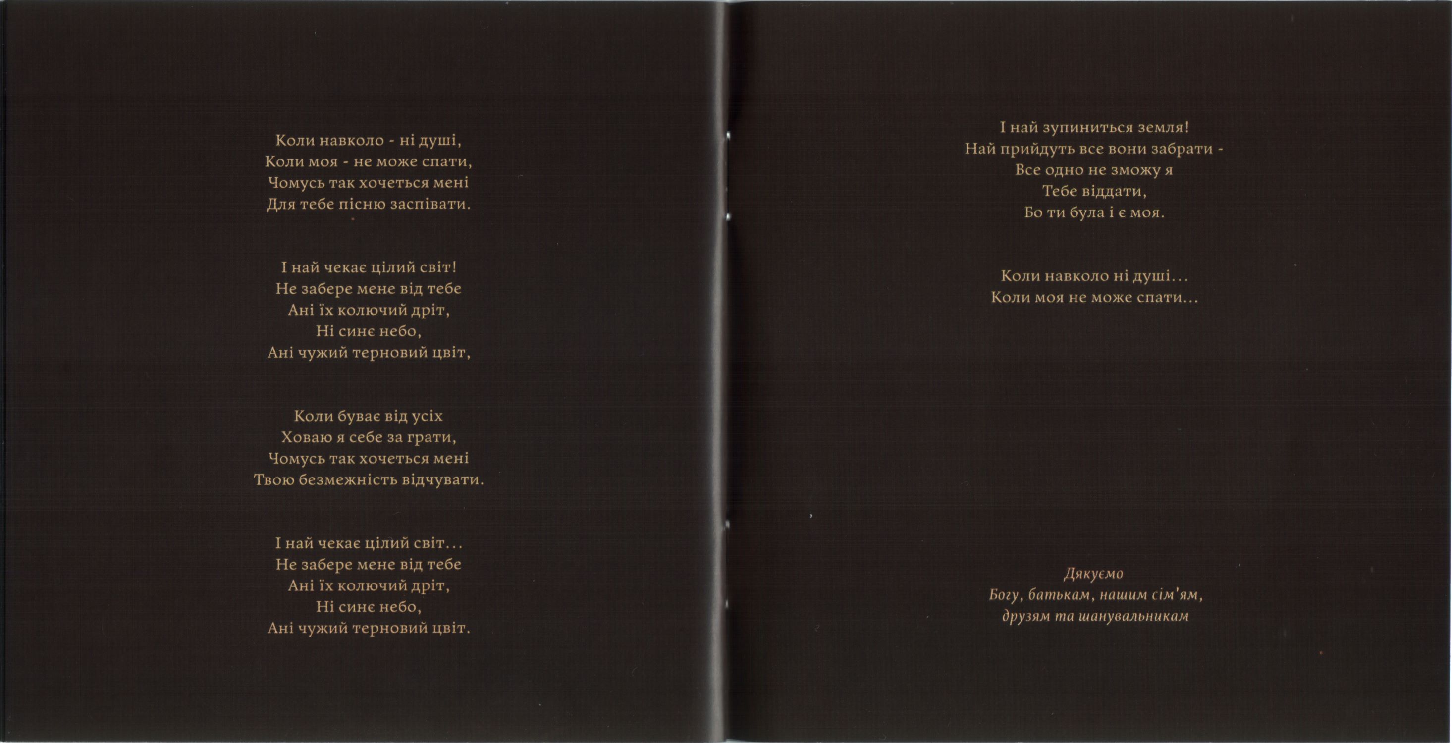 З нею (С.Вакарчук) Em7 Там, де до дому дорога моя. Там, де на мене чекає сім'я. Там, де лани, гори, поля. C Hm Em7 Там залишається моя земля. Там, де лани, гори, поля. C Hm Em7 Там починається моя земля. Там, де бажання ніколи не спить, Моя душа прокидається в мить. Знають лани, гори, поля – Тайну залишила моя земля. Знають лани, гори, поля – Тайну залишила моя земля. C+7 Hm Am З нею, тільки з нею милий світ. Dm C+7 Hm З нею, тільки з нею тане лід. C+7 Hm Am Навіть їхніх холод не такий, Dm C+7 Hm H7 Бо з нею, тільки з нею, я живий. Em7 І з нею! I з нею! I з нею! Я з нею! Там болотами ходила війна. Долі вiками ломала вона. Кров'ю людей омила поля, Тайну залишила моя земля. Кров'ю людей омила поля, Тайну залишила моя земля. Хоче на волю, але не встає. Хоче піднятись, спина не дає. Вкрита немов сонне маля, Тайною в пам'яті моя Земля. Вкрита немов сонне маля, Тайною в пам'яті моя Земля. Але тільки з нею милий світ. Але тільки з нею тане лід. Навіть їхніх холод не такий, Бо з нею, тільки з нею, я живий. І з нею! Стіна (С.Вакарчук) Fm B7 Де ми з тобою будем, C# C7 Fm Коли закінчиться їхня війна? B7 Чи вистачить нам сили, C# C7 Fm B7 C# Зробити так, щоби впала стіна, cтіна, стіна, C7 Fm7 B7 C# C7 Впала між нами стіна, стіна, стіна... Ким ми з тобою будем, Коли налиють і скажуть: "До дна!" Чи стане нам бажання, Зробити так, щоби впала стіна, стіна, стіна, Впала між нами стіна, стіна, стіна... Чи ми з тобою будем Удвох в останньому кадрі кіна? І вистачить нам сили, Зробити так, щоби впала стіна, стіна, стіна, Впала між нами стіна, стіна, стіна... C7 Fm Fm7 B7 Впала між нами стіна, стіна, стіна... C# C7 Fm Fm7 B7 Впала між нами стіна, стіна, стіна... C# C7 Fm Fm7 B7 Впала між нами стіна, стіна, стіна... C# C7 Fm Fm7 B7 Впала між нами стіна... C# C7 Fm Впала між нами стіна... Бодегіта (С.Вакарчук) Em C Літо... Летять комети над головою. Am Em Бачу кожну з них я в твоїх очах. C Літо... Воно знайомить мене з тобою, - Am Em Нотами звучить у моїх думках. Em Ей! В голові у мене літо, я зайошов у Бодегіту. Я замовив там мохіто i, як раптом тут і ти. Швидко стали плани - яркими, а рухи мої - плавними. І було тепло там, де ми. Так близько до мети... F G Em О, два мохіто! О-о, між нами буде літо. F G Em О, два мохіто! О-о, навколо Бодегіта. F G Em О, два мохіто! О-о, між нами буде... Ей! Непохитне наше бачення на мову й телебачення. Хіба то має значення, коли уже ніякі? Ми не хочем зупінятися. Ми будем обійматися. Очима напиватися, ловити кожен знак! О, два мохіто! О-о, між нами буде літо. О, два мохіто! О-о, навколо Бодегіта. О, два мохіто! Оо, між нами буде... Літо... Cкажи нам літо, чому так мало Залишаеш нам? Залишаеш нас... Незалежність (С.Вакарчук) D# B Одна в моїй кімнаті, нема куди тікати. Cm D# G# І їй напевно не поможуть навіть танки і гармати - Fm D# Моя маленька незалежність. Вона втрачає сили, у неї зводить крила. Вона, мов Жана Д'Арк, але так по кіношному красива - Моя субтильна незалежність. Cm G Cm А ти лежиш - віддавши всю себе! B D# D7 G Fm G Fm G Fm G Злiтаєш до небес, зі мною до небес... Вона була зі мною - надійною сестрою, Та взяла й зрадила мене, бо познайомившись з тобою - Сама сховалась у любові. І от, я тут, без тями. Її немає з нами - Ти випила її усю своїми жадними губами - Мою маленьку незалежність. I тут лежиш - віддавши всю себе. Злiтаєш до небес, зі мною до небес... А ти лежиш - віддавши всю себе. Злiтаєш до небес, зі мною до небес... Rendez-Vous (С.Вакарчук) Dm Який навколо видався туман – Gm F Gm Так, ніби небо бачить мій самообман. A Dm І не бере вино і кава моя не така, як треба. А я лечу і думаю про н
