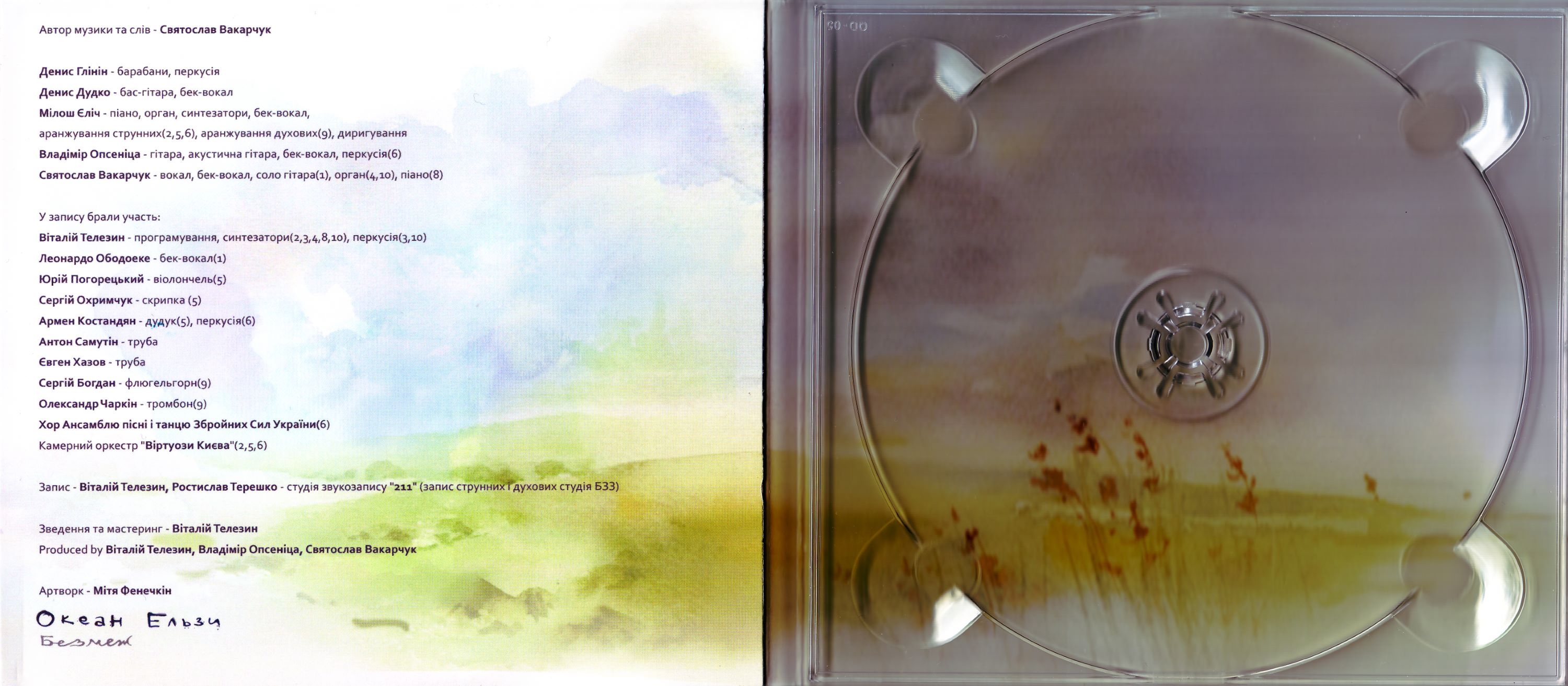Океан ЕльзиПолный список песен Разные песни Будинок зi скла (1997) Там, де нас нема (1998) Янанебiбув (2000) Модель (2001) Суперсиметрiя (2003) Gloria (2005) Мiрa (2007) Dolce Vita (2010) Земля (2013) Без меж (2016) Святослав Вакарчук Вночі (2008) Брюссель (2011) Оранжерея (2021) |