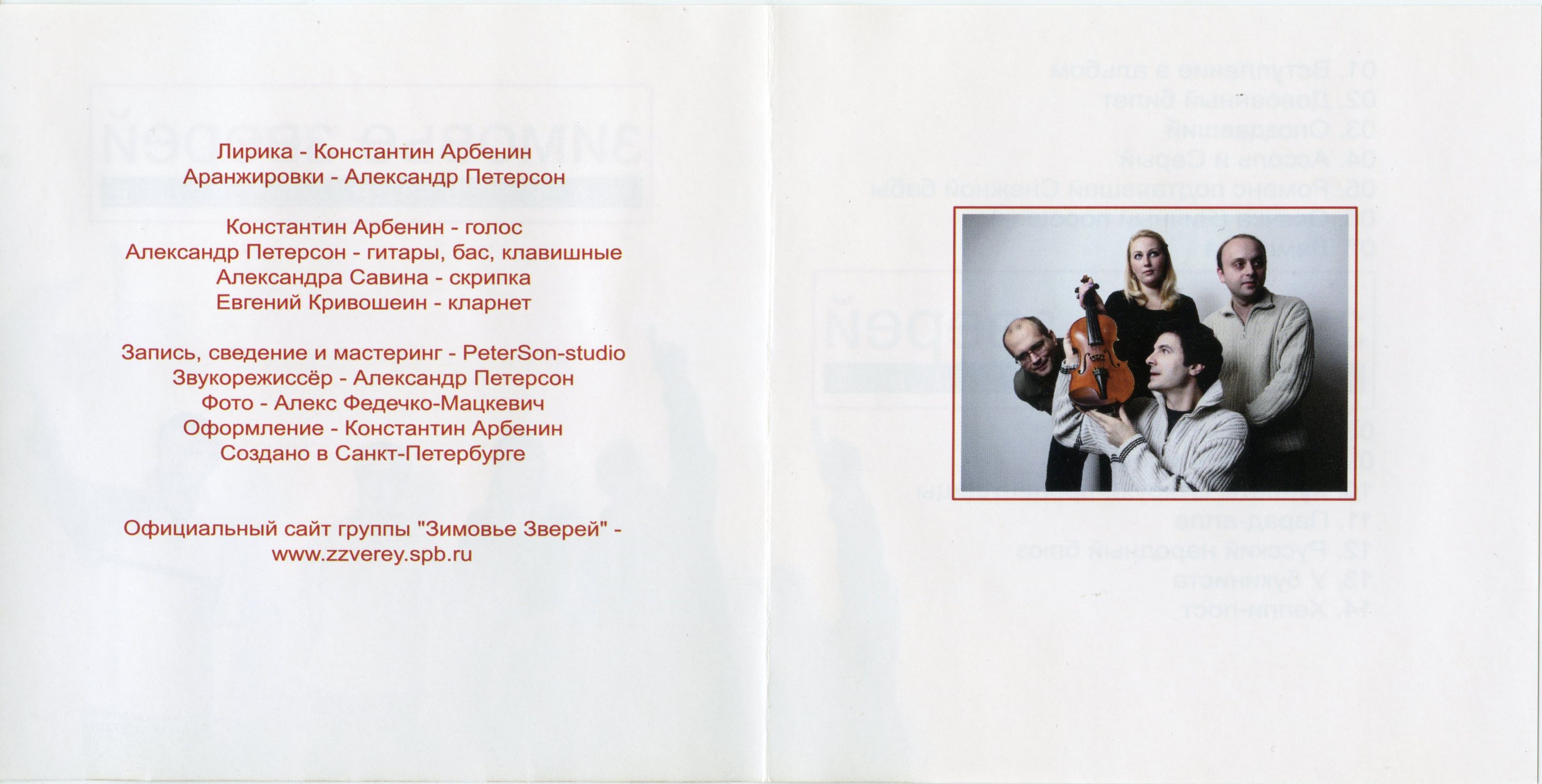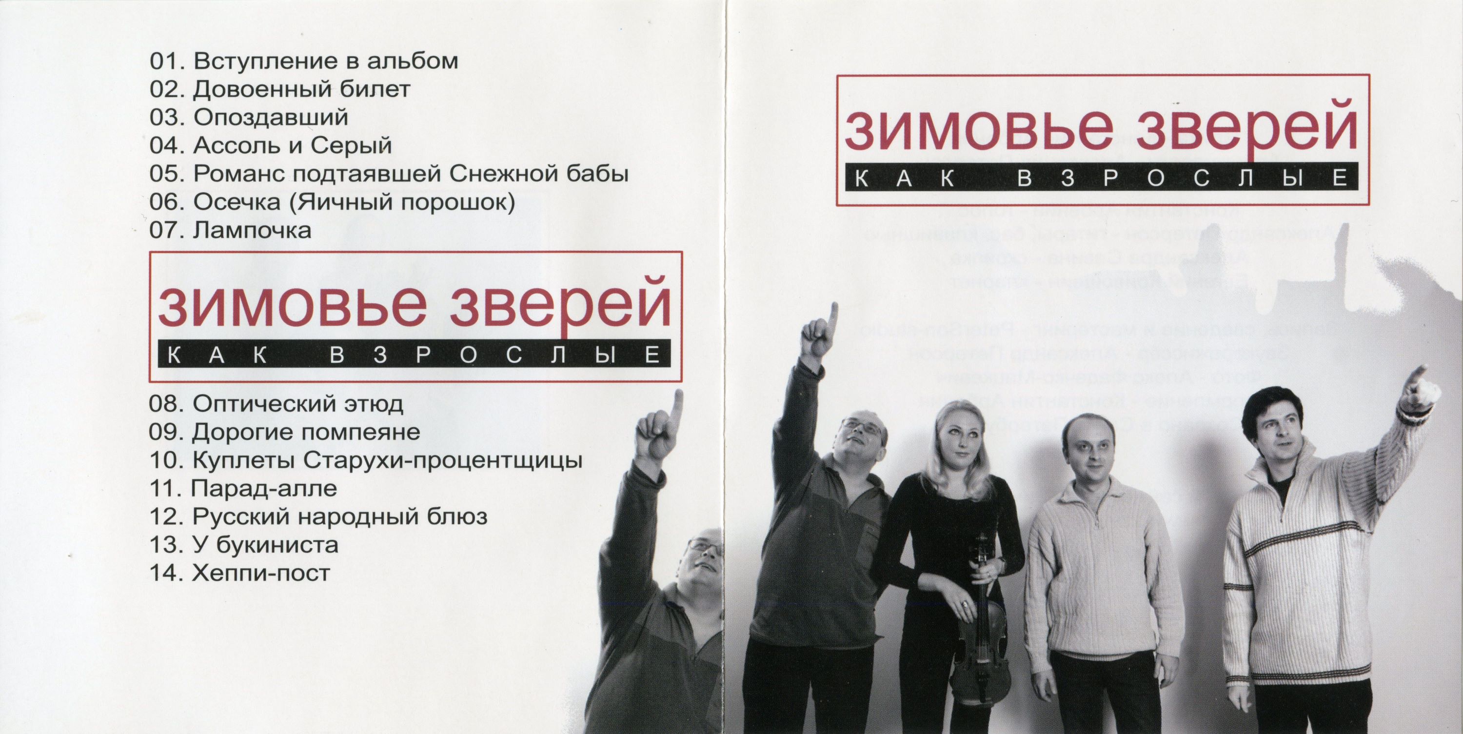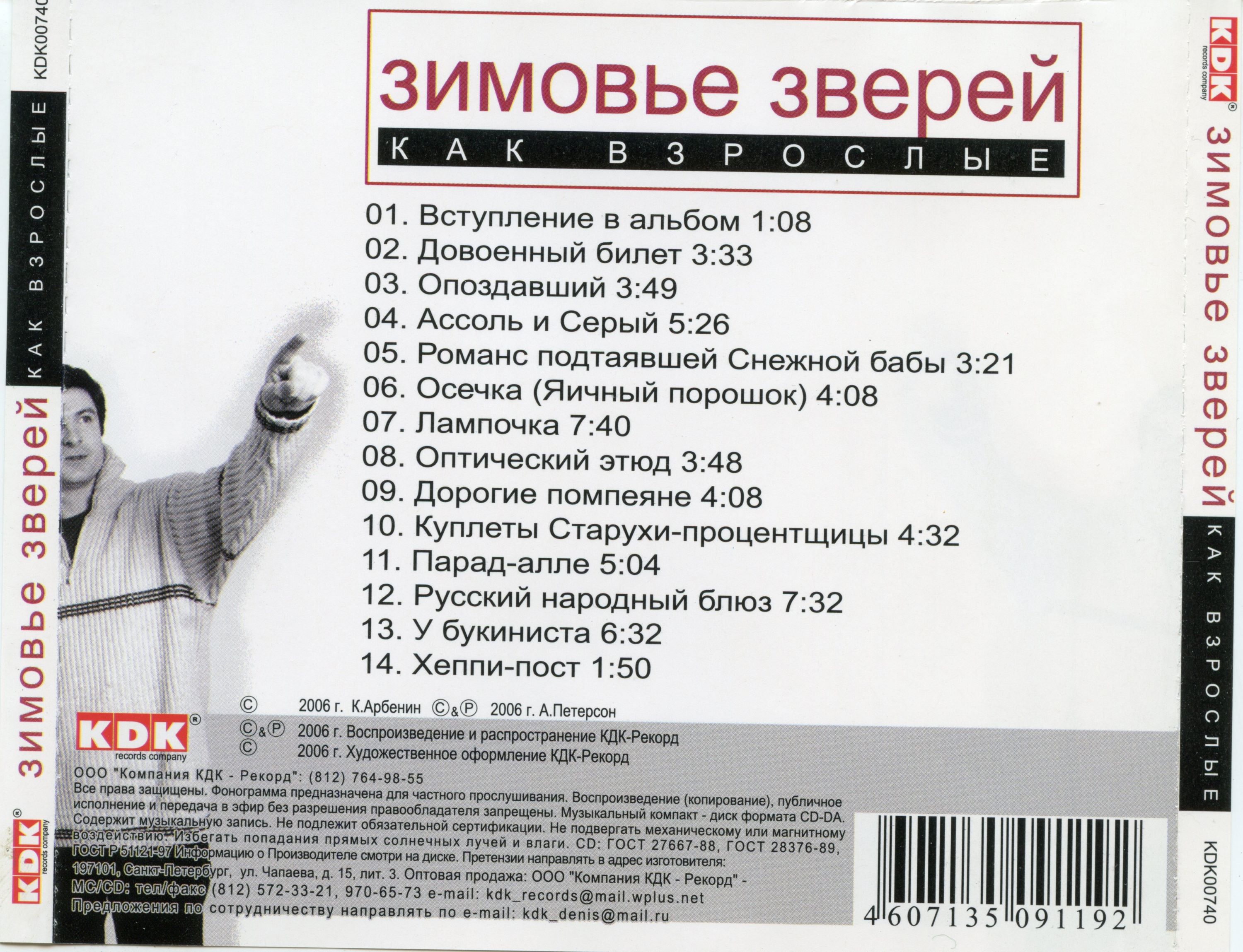 Зимовье зверейПолный список песен Города, которых не стало (1995) Число человека (1996) В зоопарке (1997) Плечи (1997) Свидетели (1997) Оба неба (1998) Родословная (1999) Вещи со своими именами, возвращение именных вещей (1999) Свинопас (1999) Акустическая родословная (2000) Конец цитаты (2001) Антиутопия (2002) На третьем римском (2002) Звери ищут лето (2003) Post Форпост (2003) Шишки (2005) Как взрослые (2006) Всегда готов к рок-н-роллу (2008) Новейшая хронология (2018) Неделимый (2025) Константин Арбенин Иждевенец (1994) Константин Арбенин и Георгий Высоцкий - Клубный квартирник (1995) Забудьте слово (1998) АрБаКом - Концерт (2002) Сказки на засыпку (2002) Вечер у Блока (2003) Сказки (2007) Стихи (2007) АрБаКом - Блюзы и баллады под гитару и без (2009) Одноименные песни. Live (2010) Жили Дали (2012) Константин Арбенин и Вадим Курылёв - Двое в городе (2023) Сердолик Горошина (2012) Неспокойная красота жизни (2013) |