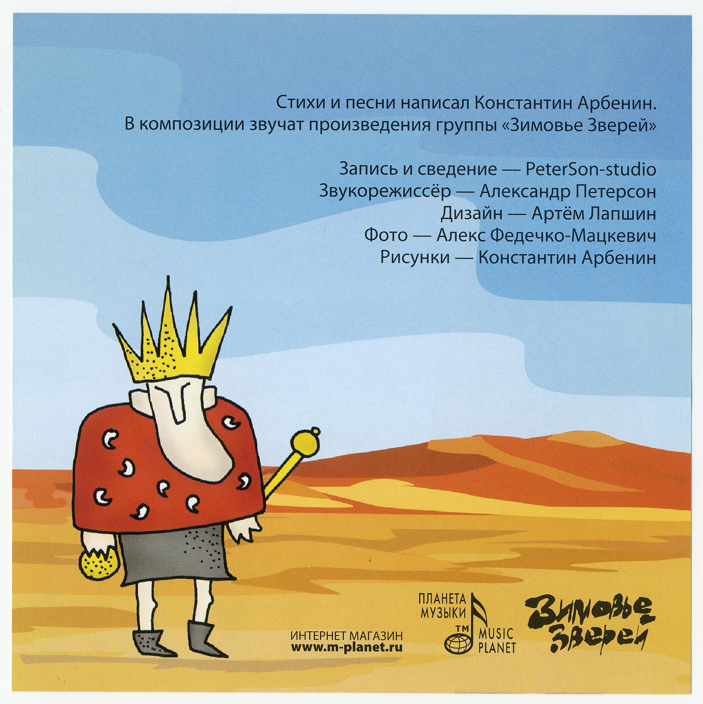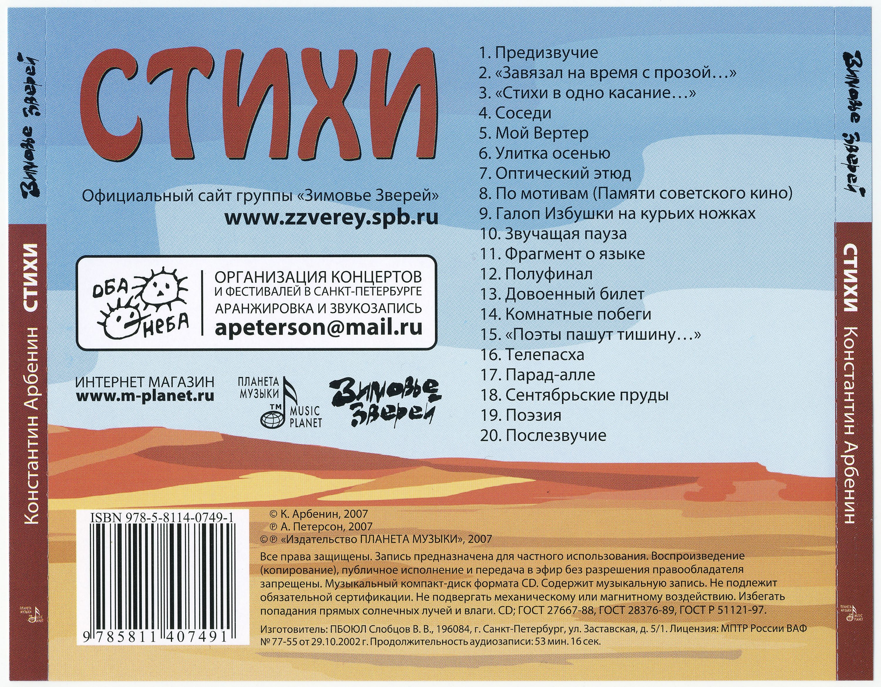 Зимовье зверейПолный список песен Города, которых не стало (1995) Число человека (1996) В зоопарке (1997) Плечи (1997) Свидетели (1997) Оба неба (1998) Родословная (1999) Вещи со своими именами, возвращение именных вещей (1999) Свинопас (1999) Акустическая родословная (2000) Конец цитаты (2001) Антиутопия (2002) На третьем римском (2002) Звери ищут лето (2003) Post Форпост (2003) Шишки (2005) Как взрослые (2006) Всегда готов к рок-н-роллу (2008) Новейшая хронология (2018) Неделимый (2025) Константин Арбенин Иждевенец (1994) Константин Арбенин и Георгий Высоцкий - Клубный квартирник (1995) Забудьте слово (1998) АрБаКом - Концерт (2002) Сказки на засыпку (2002) Вечер у Блока (2003) Сказки (2007) Стихи (2007) АрБаКом - Блюзы и баллады под гитару и без (2009) Одноименные песни. Live (2010) Жили Дали (2012) Константин Арбенин и Вадим Курылёв - Двое в городе (2023) Сердолик Горошина (2012) Неспокойная красота жизни (2013) |