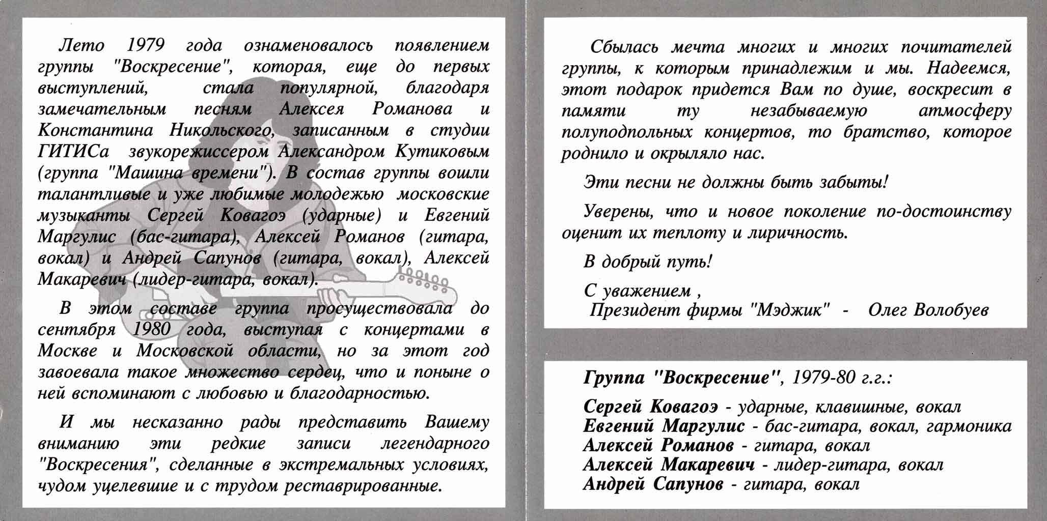 Воскресение, СВ, Лотос, СапуновПолный список песен Разные песни Кто виноват (1979-80) Воскресенье (1981) Не торопясь (2003) СВ - Радуюсь (1983) СВ - Московское время (1984) СВ - Москва и Москвичи (1986) СВ - Возвращение (1987) СВ - Солдат Вселенной (1990) СВ - Я знаю (1991) СВ - До свидания (1993) СВ - Живая коллекция (1998) СВ и Александр Лерман - Ветры перемен (1995) СВ и Александр Лерман - Перемена ветра / Time Is Gold (1998) Лотос (1987) Романов, Сапунов, Кобзон - Семь вещей (1995) Андрей Сапунов - Звон (1993) Трио Сапунова - Живая коллекция (2001) |