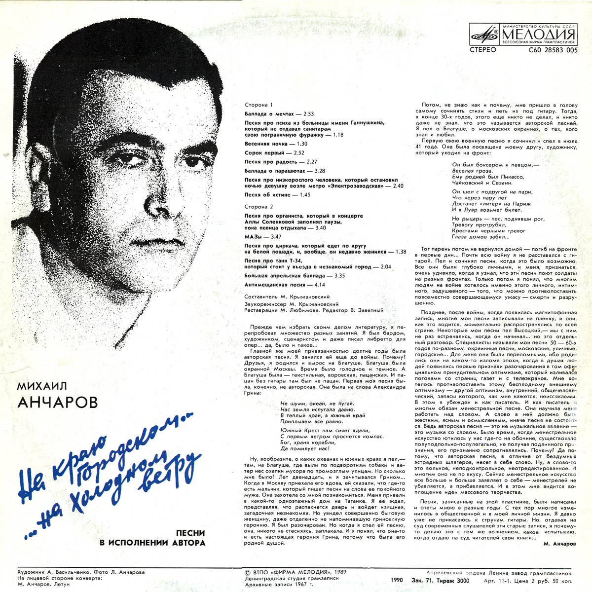 Михаил АнчаровПолный список песен Разные песни На краю городском... На холодном ветру... (1989) Лучшие песни (2000) Российские барды (2000) Песни Михаила Анчарова (2007) |