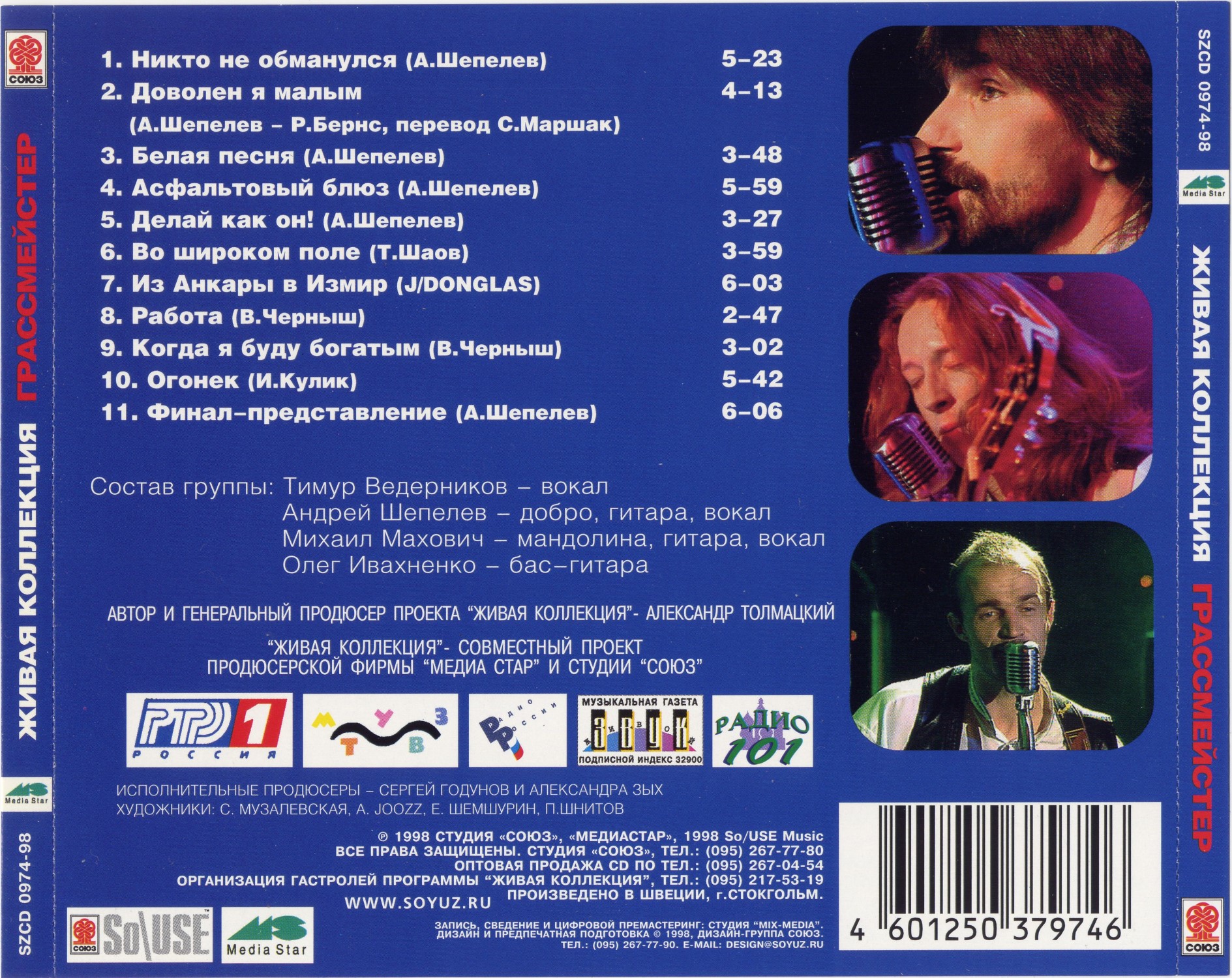 ГрассмейстерПолный список песен Трава по пояс (1996) Живая коллекция (1998) Время цветов (2001) Деревянный рокенрол (2002) Лучшие партии (2004) Повод, чтоб всё началось (2008) |